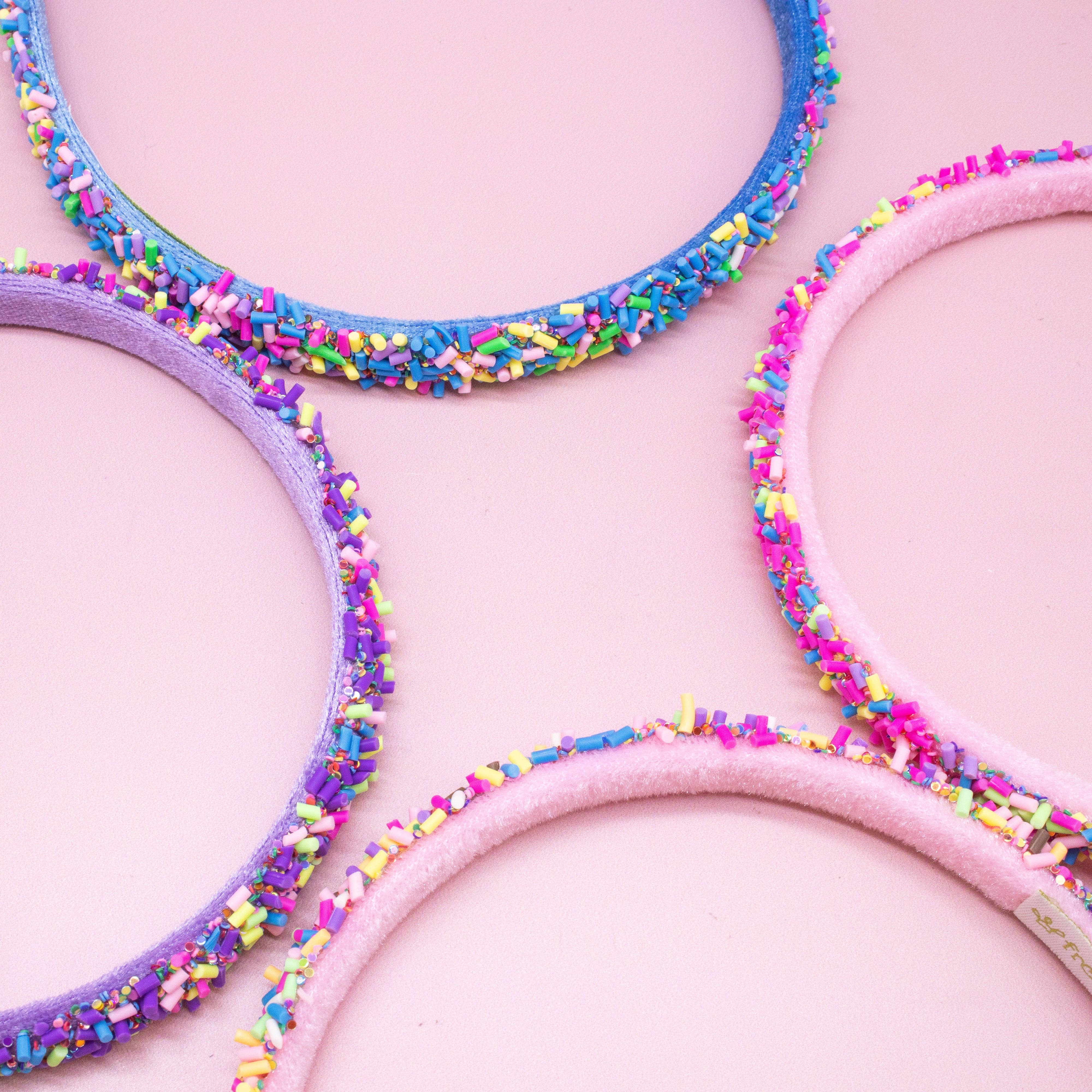 * Thin headband made with chunky polymer clay sprinkles  Flexible 13" size to best fit kids to tweens * Thin 0.5" width headband * Non slip velvet inner material * Sparkly non slip statement hair band
