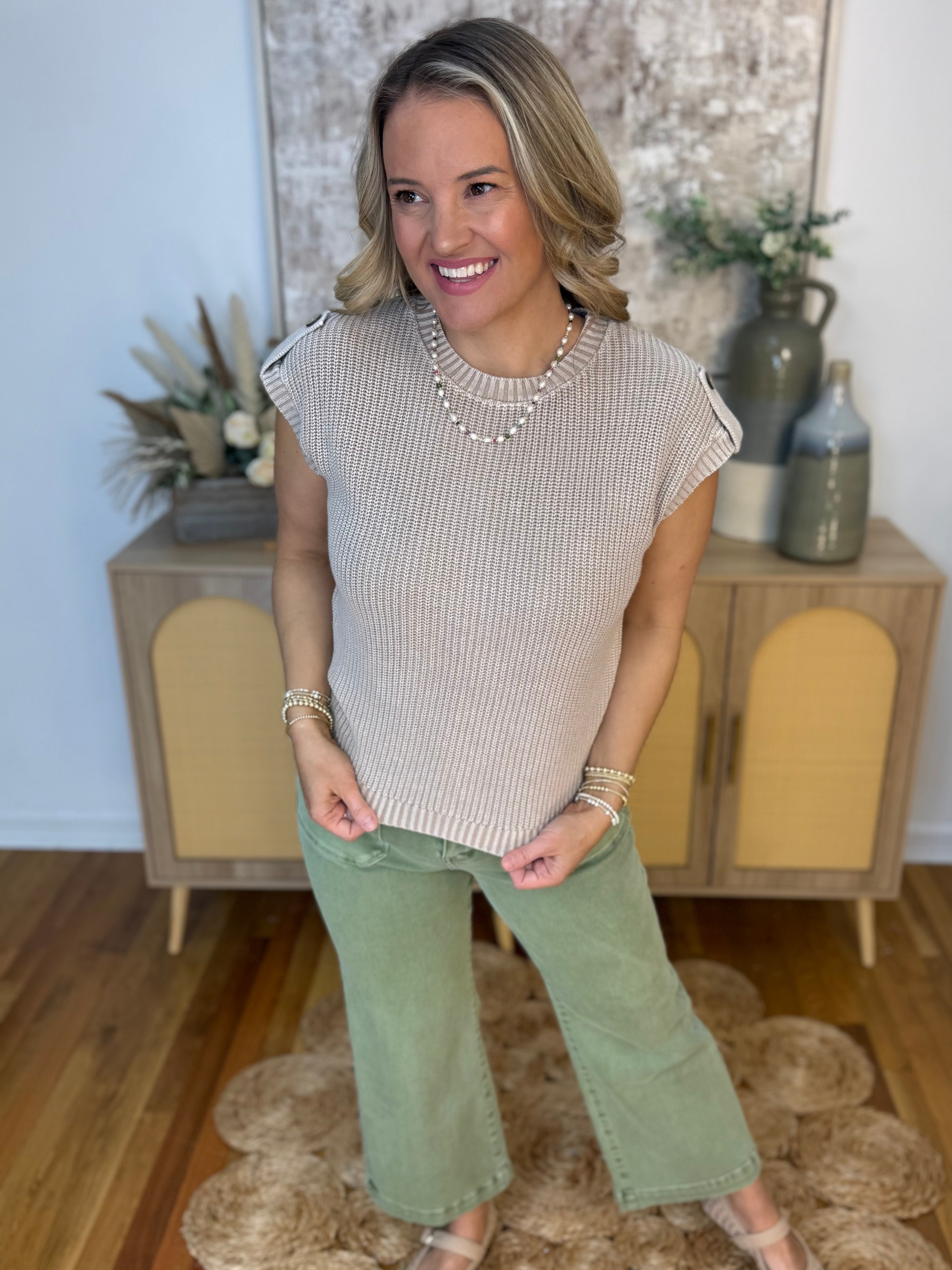 The Weekend Getaway Top in Wheat is warm, versatile, and effortlessly chic! This acid wash crew neck knit features unique tab sleeve details and mock button accents that add personality and charm. The beautiful wheat tone is a warm neutral that coordinates perfectly with the Resort Ready collection's light and airy palette.