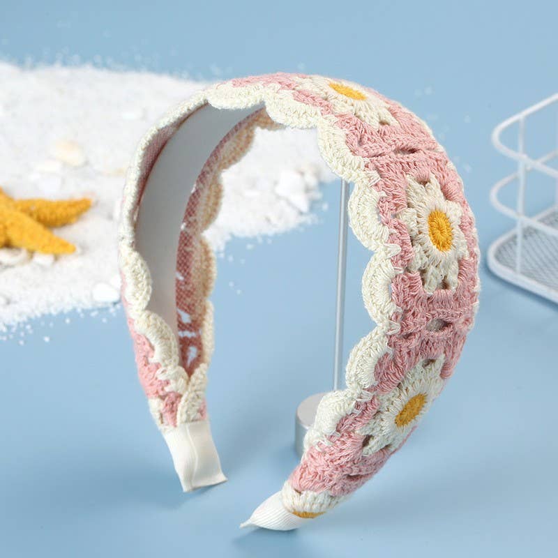 FLORAL CROCHET SOFT WOVEN KNIT HEADBAND HAIR BAND - Pink