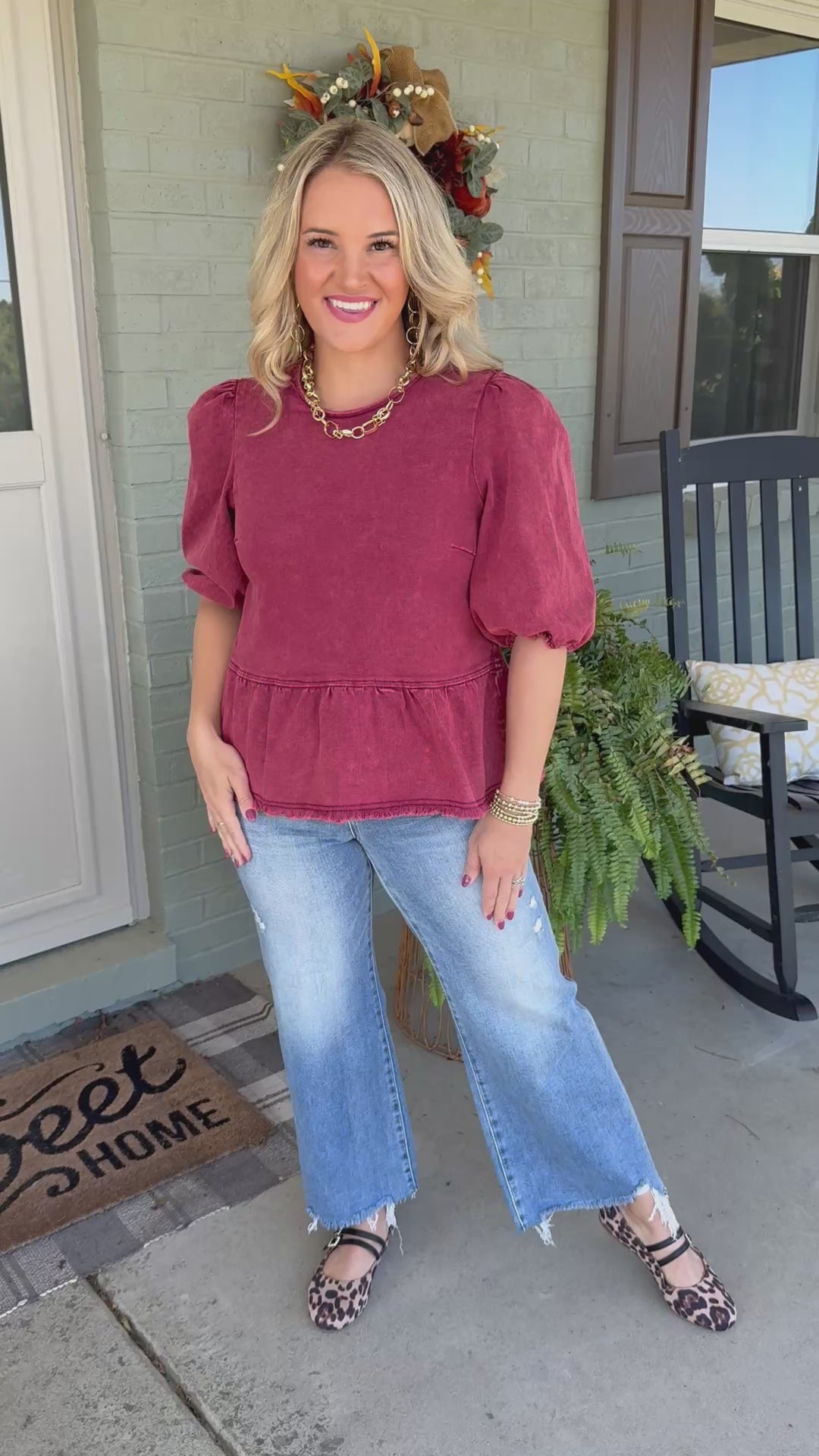 Make a bold statement with the Cider & Cinnamon Washed Denim Top, crafted in a rich garnet plum hue that’s absolutely stunning. Featuring puff sleeves for feminine volume and beautiful buttons down the back, this top blends elevated details with amazing quality for a piece that stands out in every season.